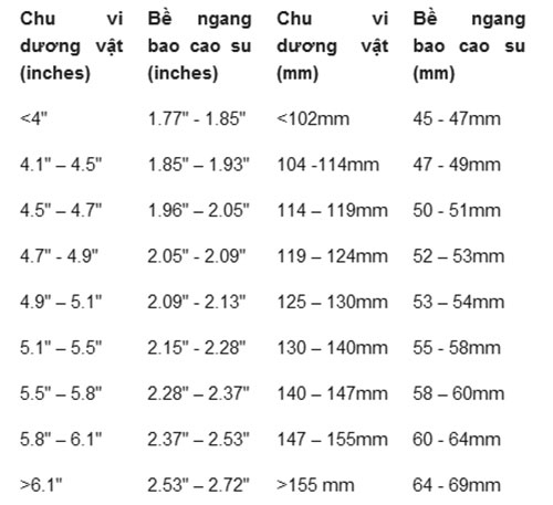 Sau khi đo được chu vi và chiều dài, bạn hãy so sánh với bảng kích cỡ bao cao su phổ biến hiện nay: