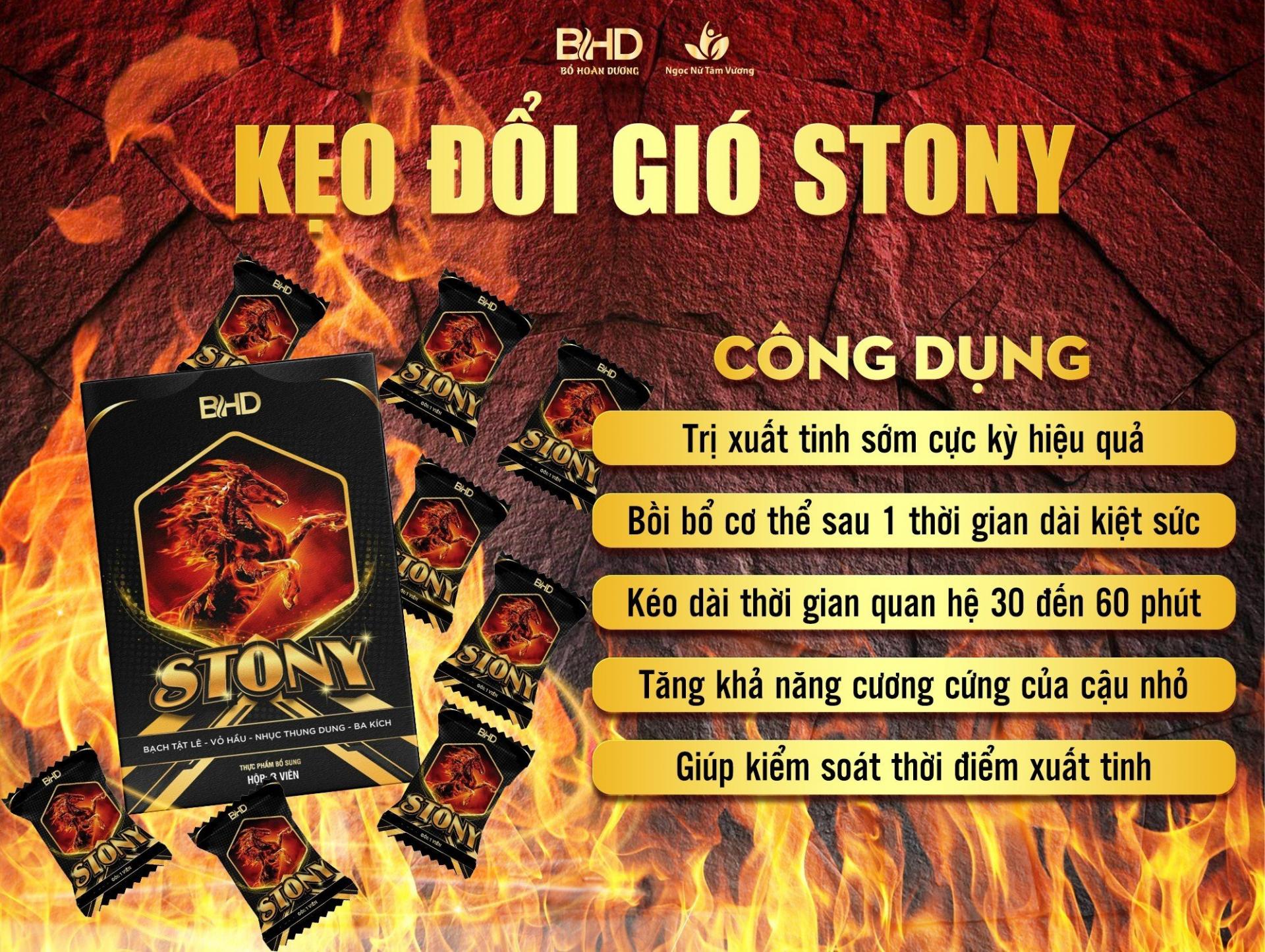 Kẹo Stony hay kẹo đổi gió Stony, là dòng sản phẩm được bào chế hoàn toàn từ các loại thảo dược có nguồn gốc từ thiên nhiên, giúp bồi bổ sức khỏe sinh lý cho anh em nam giới một cách hiệu quả và bền vững. Kẹo Stony là sản phẩm có nguồn gốc xuất xứ từ Việt Nam, đa được sản xuất theo những dây chuyền công nghệ hiện đại, khép kín nhất hiện nay. Hiện sản phẩm này đã đạt tiêu chuẩn GMP của WHO cấp, do Công ty TNHH Thương mại và Dịch vụ Ngọc Nữ Protect Health chịu trách nhiệm sản xuất và phân phối ra thị trường.