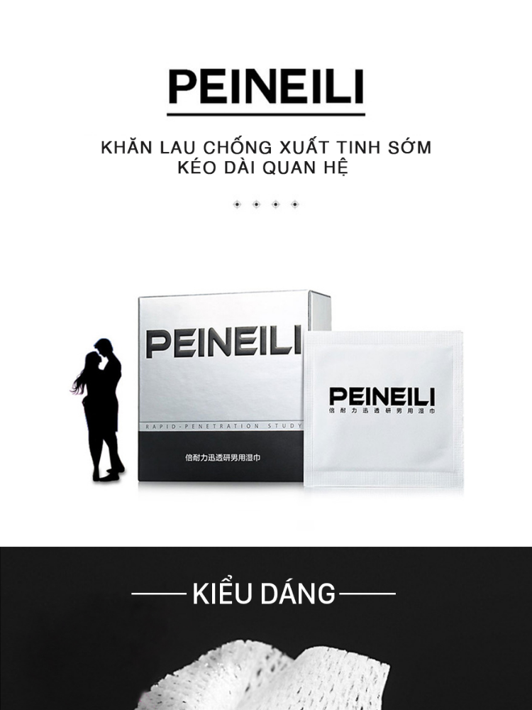 - Khăn chống xuất tinh sớm, kéo dài thời gian quan hệ Peineili kiểm soát việc xuất tinh sớm bằng cách sử dụng công nghệ chuyển giao thẩm thấu qua da rất an toàn khi sử dụng, mang đến hiệu quả nhanh chóng, có khả năng tăng thời gian quan hệ lên đến hơn 30p*